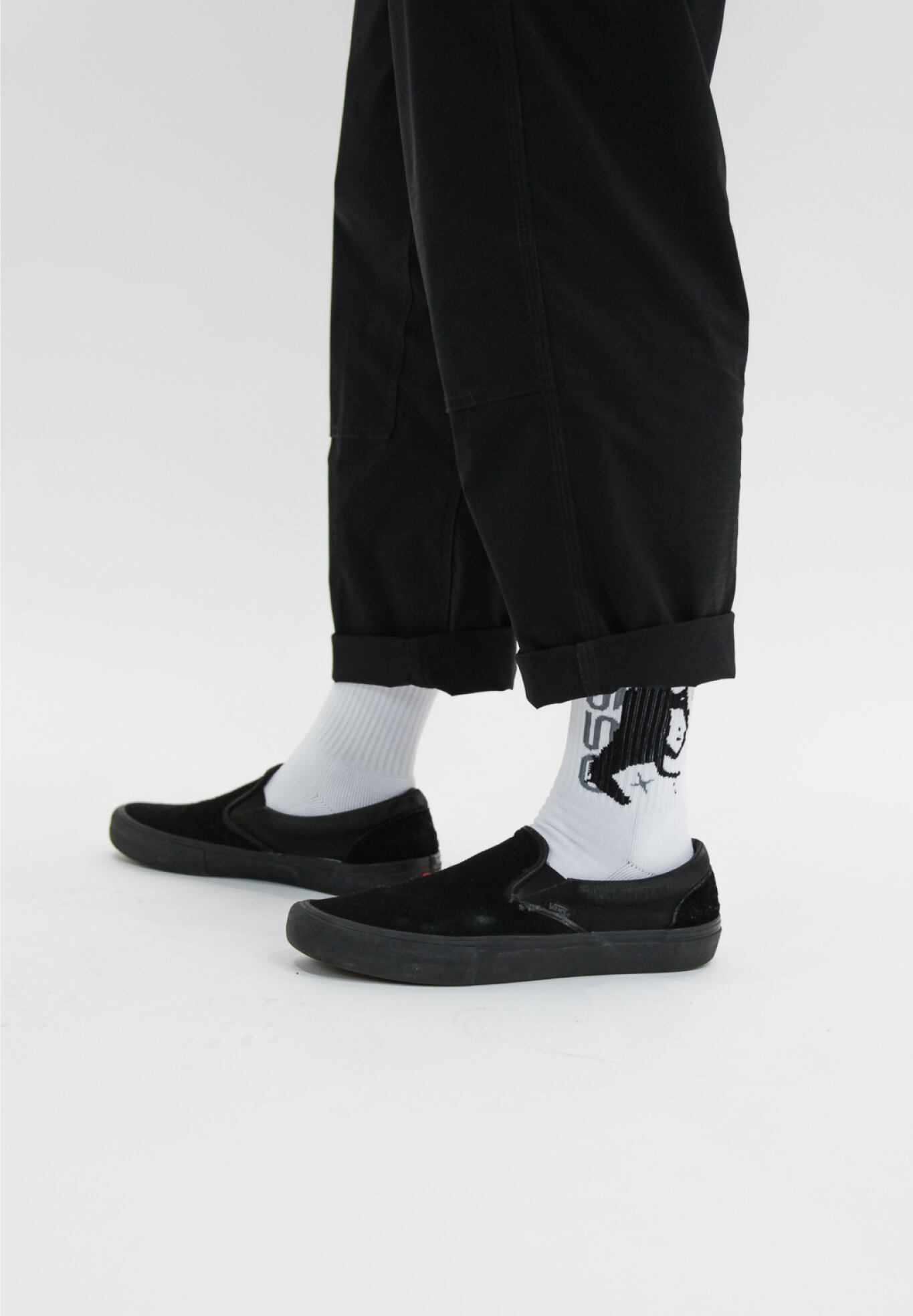 ※在庫数が少ないため受注生産になります。 ※発送まで1~2週間かかる場合がありますご了承ください。 MATERIAL : コットン60%、アクリル20%、ポリエステル15%、ナイロン5% ※足底パイル仕様 COLOR : ブラック / ホワイト SIZE : ONE SIZE (26 - 29cm) ミドル 約170mm ※お洗濯により多少の縮みが発生します。
